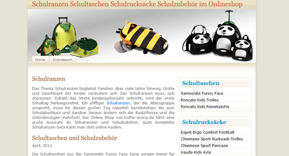 Wenn Sie sich über die Eigenschaften im Klaren sind, welche den zu kaufenden Schulranzen ausmachen, steht dem Kauf nichts mehr im Wege und Sie können sich in einem Onlineshop wie schulranzen-arena.de umschauen und finden bestimmt den richtigen Schulranzen für Ihr Kind. Im Onlineshop für Schulranzen finden Sie eine große Auswahl an verschiedenen Ranzen sowie Taschen und Schulrucksäcke aller gängiger Marken. Im Bereich Schulranzen gibt es günstige Setangebote. Außerdem im Programm hat dieser Onlineshop Sporttaschen und Schirme für Ihr Schulkind.